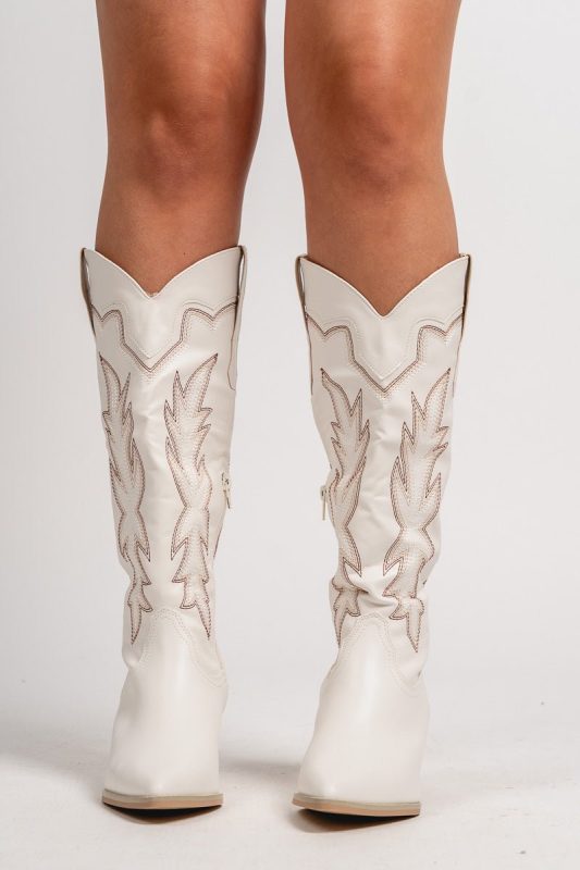 Classic white leather cowboy boot featuring black and taupe stitching throughout from Lush Fashion Lounge women's boutique in Oklahoma City. Lush bout