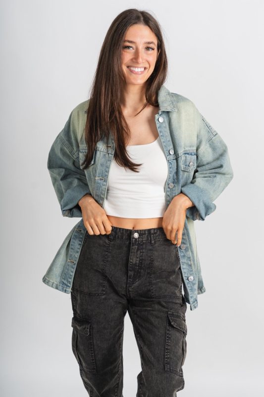 Denim shacket from Lush Fashion Lounge women's boutique in Oklahoma City.Lush boutique in OKC has a variety of cute jackets, shackets, and more! This