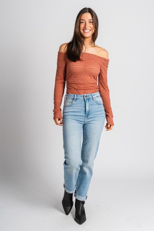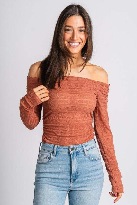 Off shoulder lace bodysuit from Lush Fashion Lounge women's boutique in Oklahoma City.Lush boutique in OKC has a variety of cute bodysuits and more! T