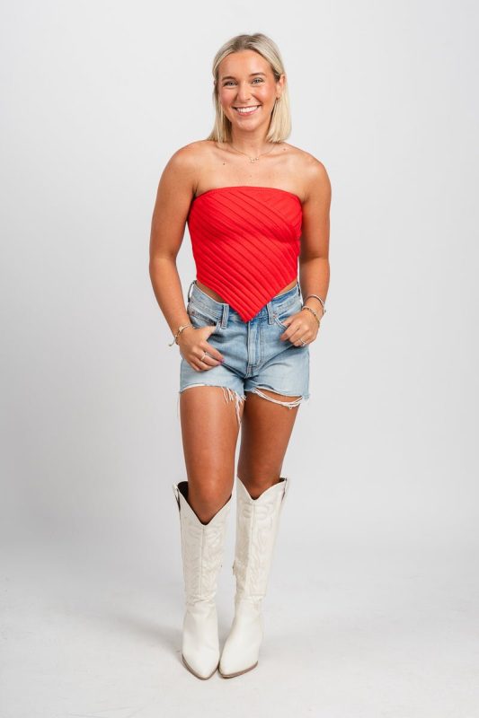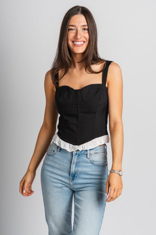 Ruffle corset top from Lush Fashion Lounge women's boutique in Oklahoma City.Lush boutique in OKC has a variety of cute tops and more! This trendy cor