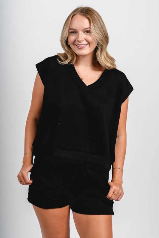 Sleeveless scuba v-neck top from Lush Fashion Lounge women's boutique in Oklahoma City.Lush boutique in OKC has a variety of cute matching sets for Su