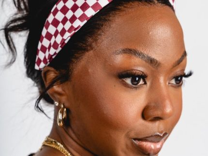Burgundy and white checkered headband featuring a knot at the top of headband from Lush Fashion Lounge women's boutique in Oklahoma City.Lush boutique