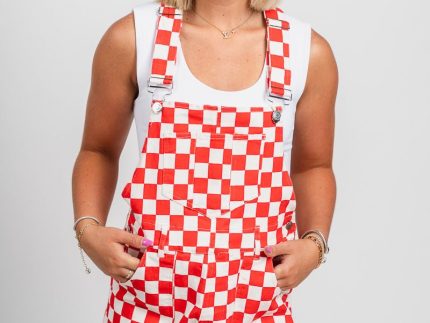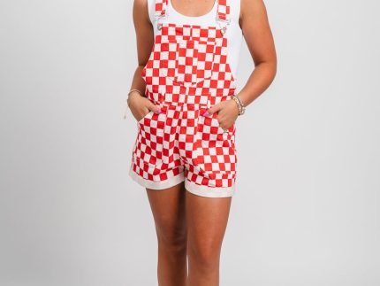 Red and white checkered shorts overalls with a chest pocket, belt loops, hip pockets, and cuffed shorts from Lush Fashion Lounge women's boutique in O