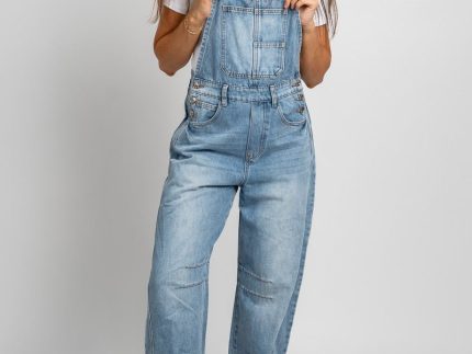 Full length denim overalls featuring curved barrel style pant legs from Lush Fashion Lounge women's boutique in Oklahoma City.Lush boutique in OKC has