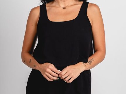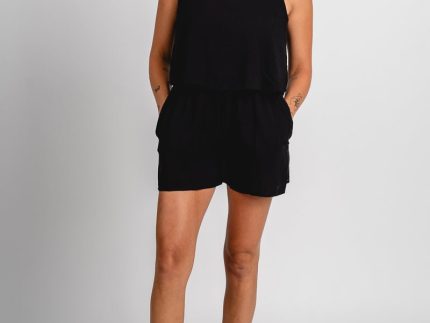 Black sleeveless romper that cinches at the waist with a flowy overlay top and flowy shorts with pockets from Lush Fashion Lounge women's boutique in