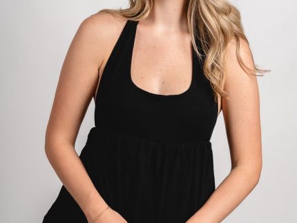 Knit black babydoll romper with a ribbed top that ties around the neck featuring a black skirt with ribbed shorts underneath from Lush Fashion Lounge