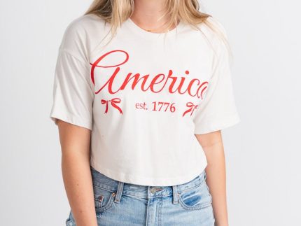 America bows cropped tee from Lush Fashion Lounge women's boutique in Oklahoma City.Lush boutique in OKC has a variety of cute 4th of July t-shirts, 4