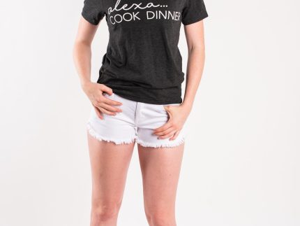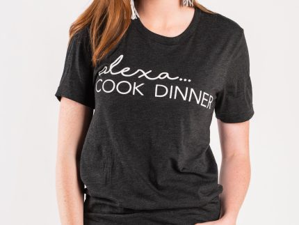 Alexa cook dinner unisex short sleeve t-shirt charcoal.50% polyester 25% cotton 25% rayon.Model is 5’7 size 27 wearing small.