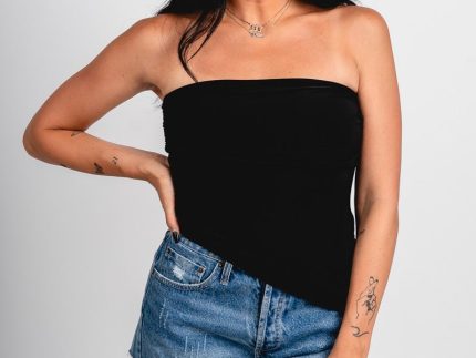 Strapless black top with an asymmetrical hem line from Lush Fashion Lounge women's boutique in Oklahoma City.Lush boutique in OKC has a variety of cut