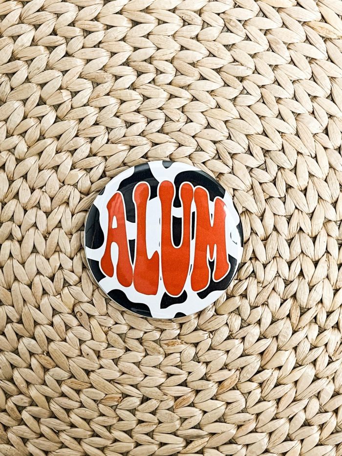 Alum cow print game day button from Lush Fashion Lounge women’s boutique in Oklahoma City.Lush boutique in OKC has a variety of cute gameday accessori