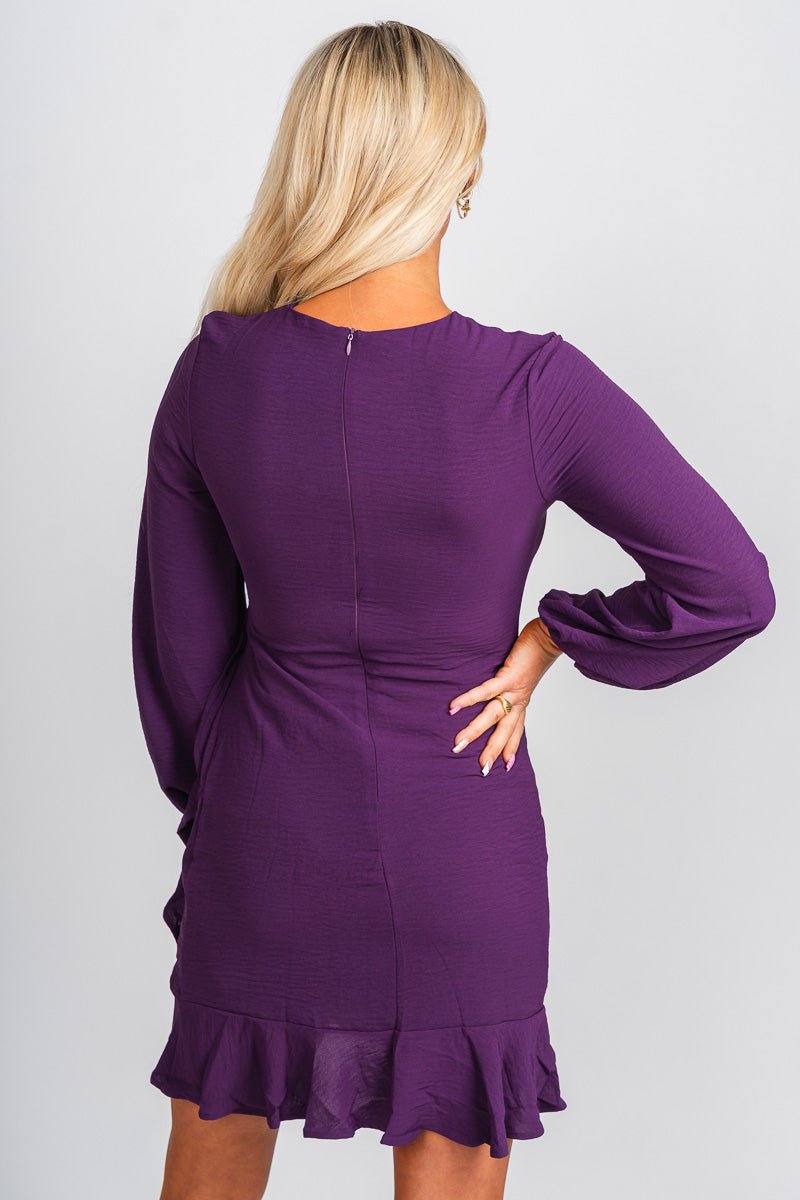 Asymmetrical long sleeve dress from Lush Fashion Lounge women’s boutique in Oklahoma City.Lush boutique in OKC has a variety of cute dresses and more!