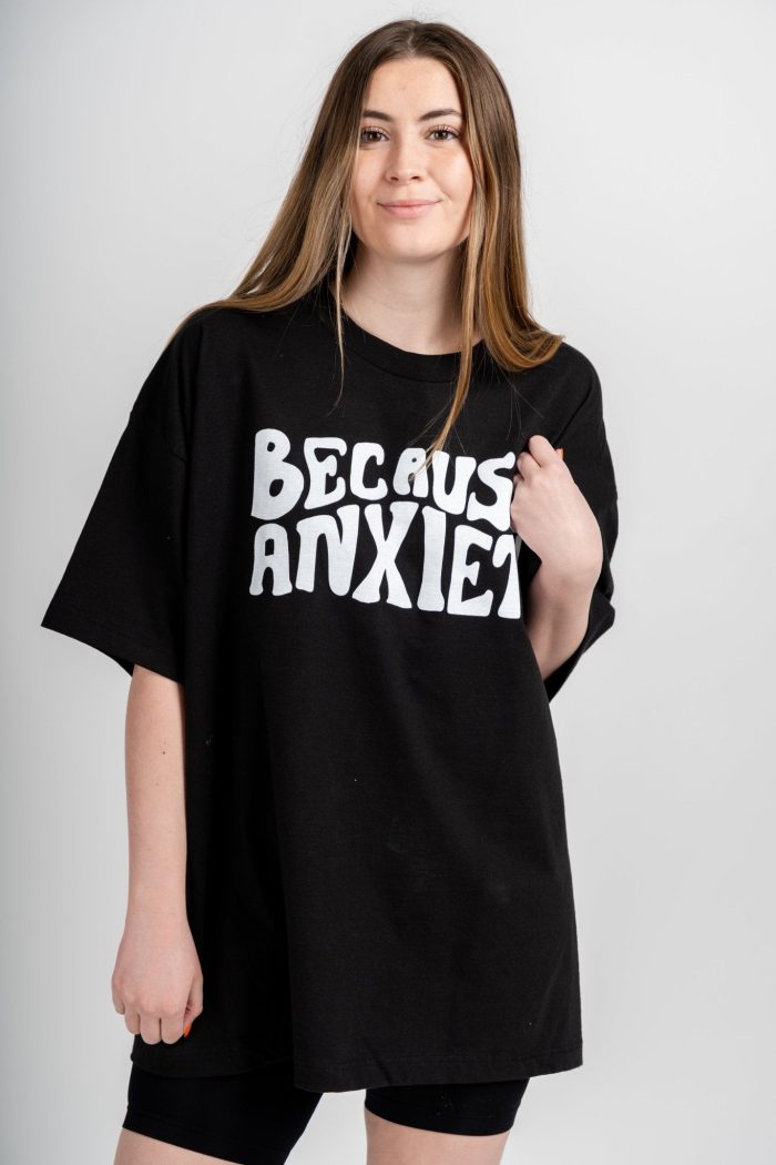 Because anxiety oversized t-shirt from Lush Fashion Lounge women’s boutique in Oklahoma City.Lush boutique in OKC has a variety of cute graphic t-shir