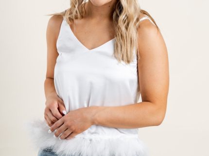 Feather trim cami tank top from Lush Fashion Lounge women’s boutique in Oklahoma City.Lush boutique in OKC has a variety