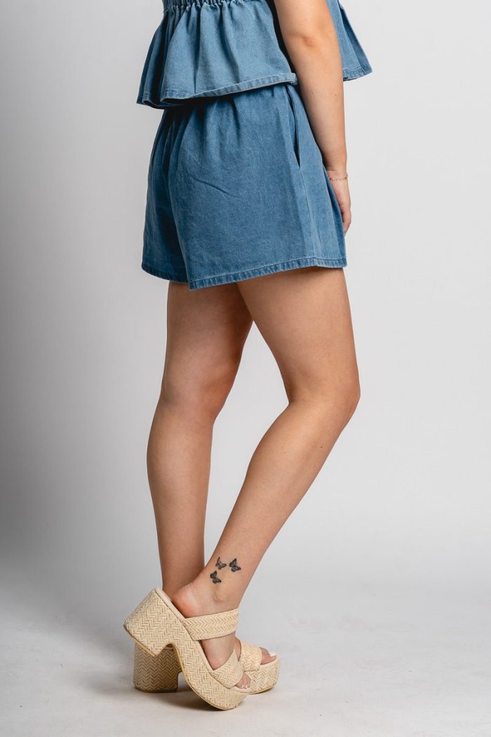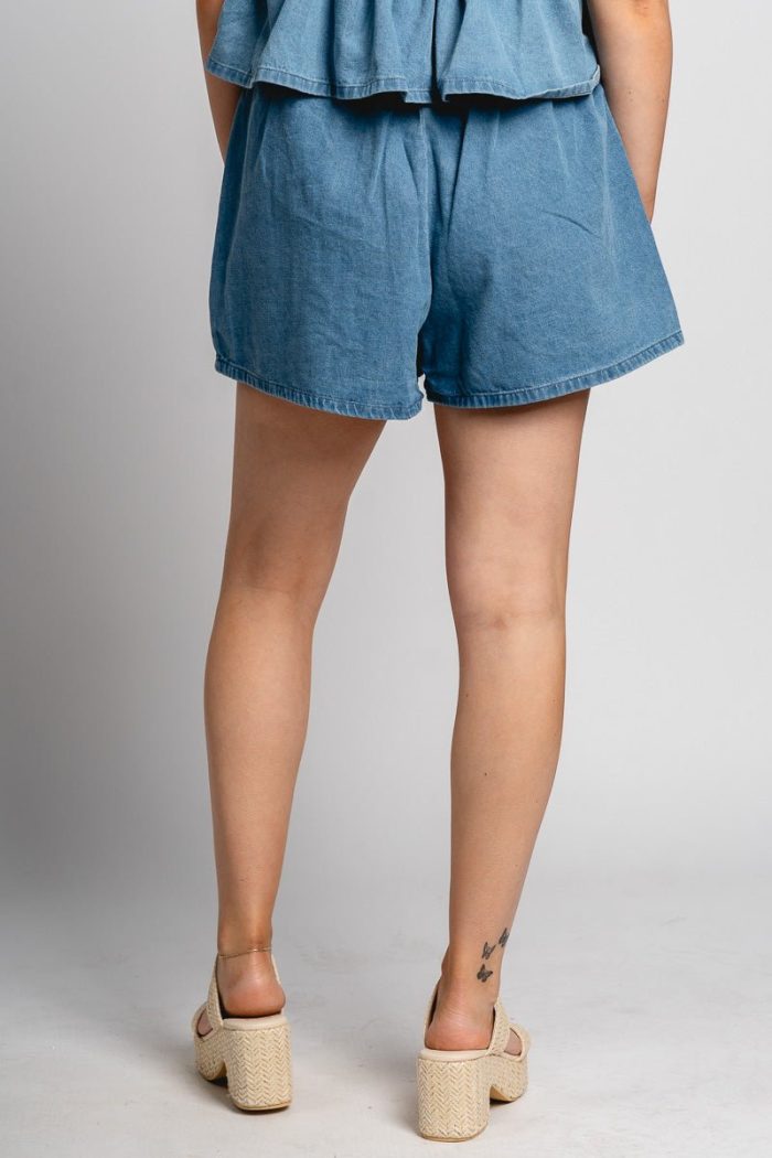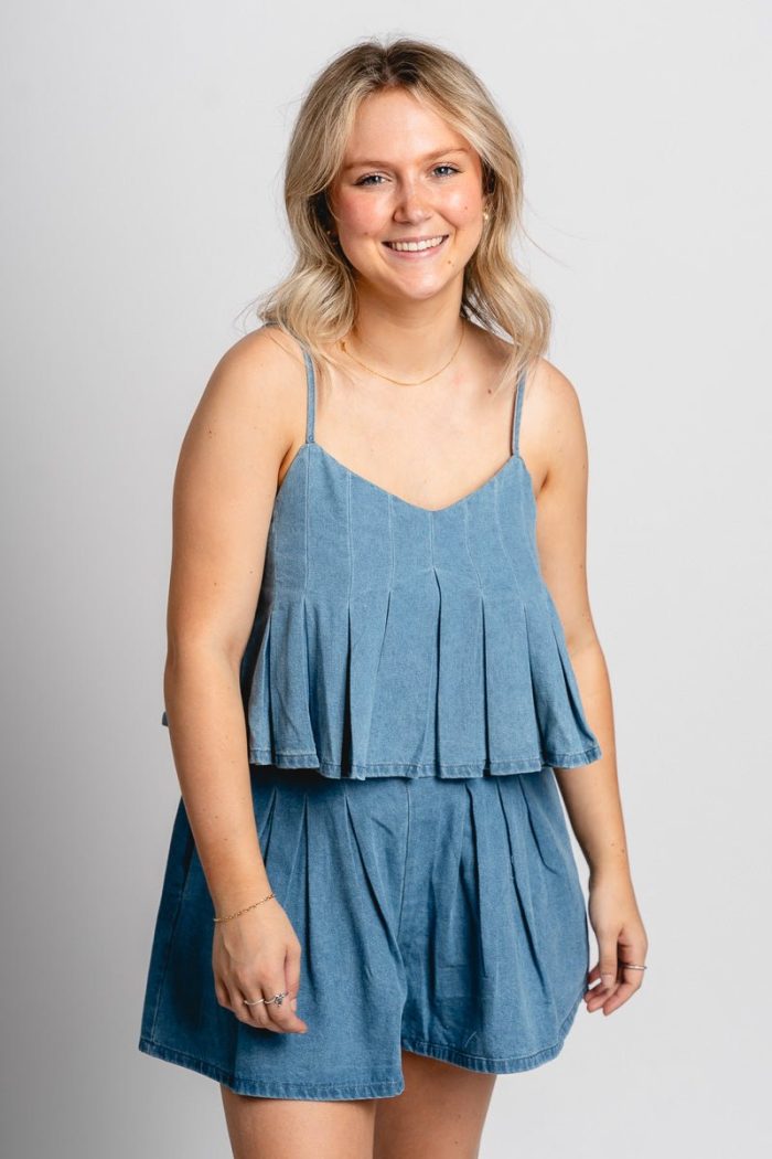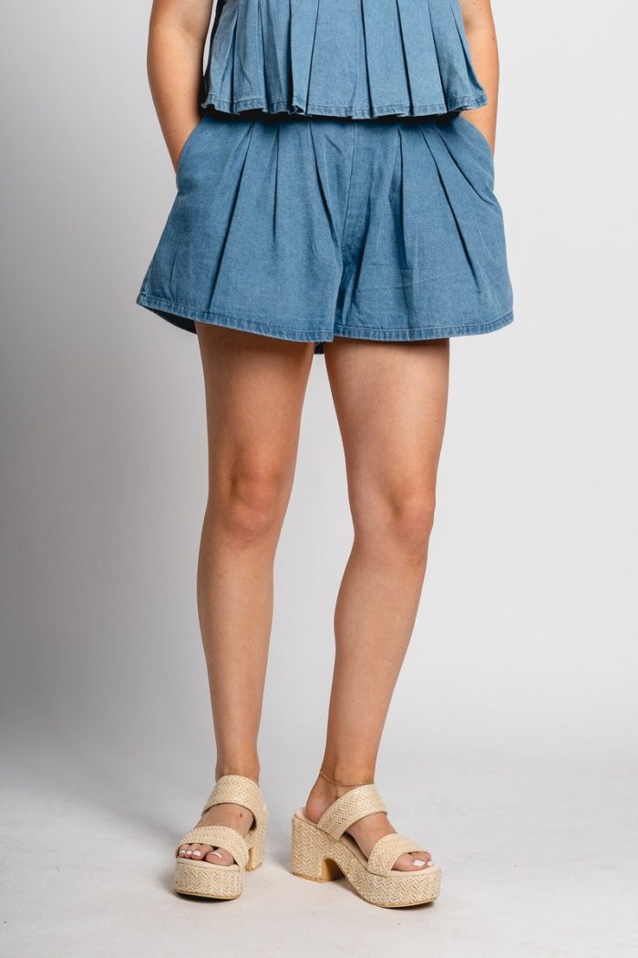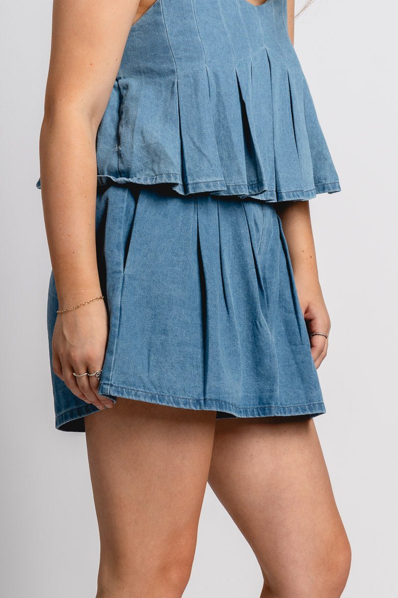 Denim pleated skort from Lush Fashion Lounge women’s boutique in Oklahoma City.Lush boutique in OKC has a variety of cute matching sets! This trendy m
