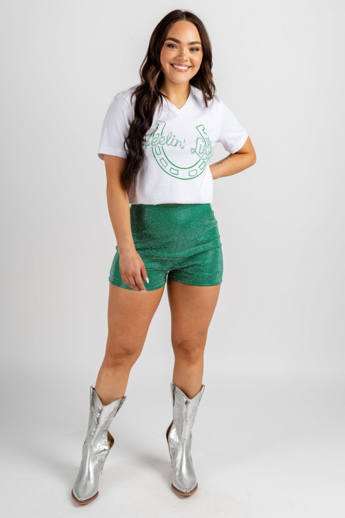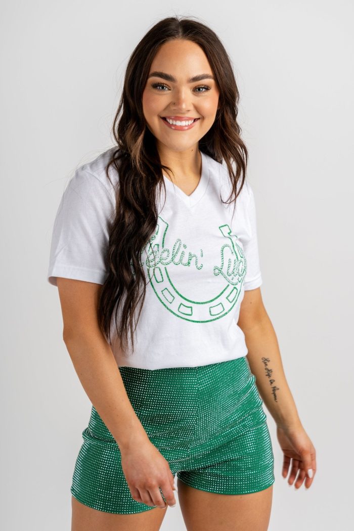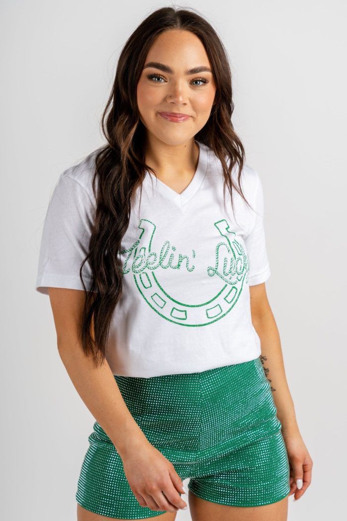 Feelin’ lucky v-neck t-shirt from Lush Fashion Lounge women’s boutique in Oklahoma City.