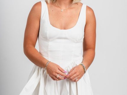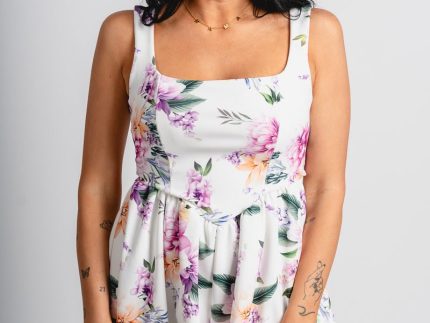 Off white sleeveless romper with corset like top and flare bottom from Lush Fashion Lounge women's boutique in Oklahoma City.Lush boutique in OKC has