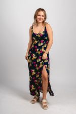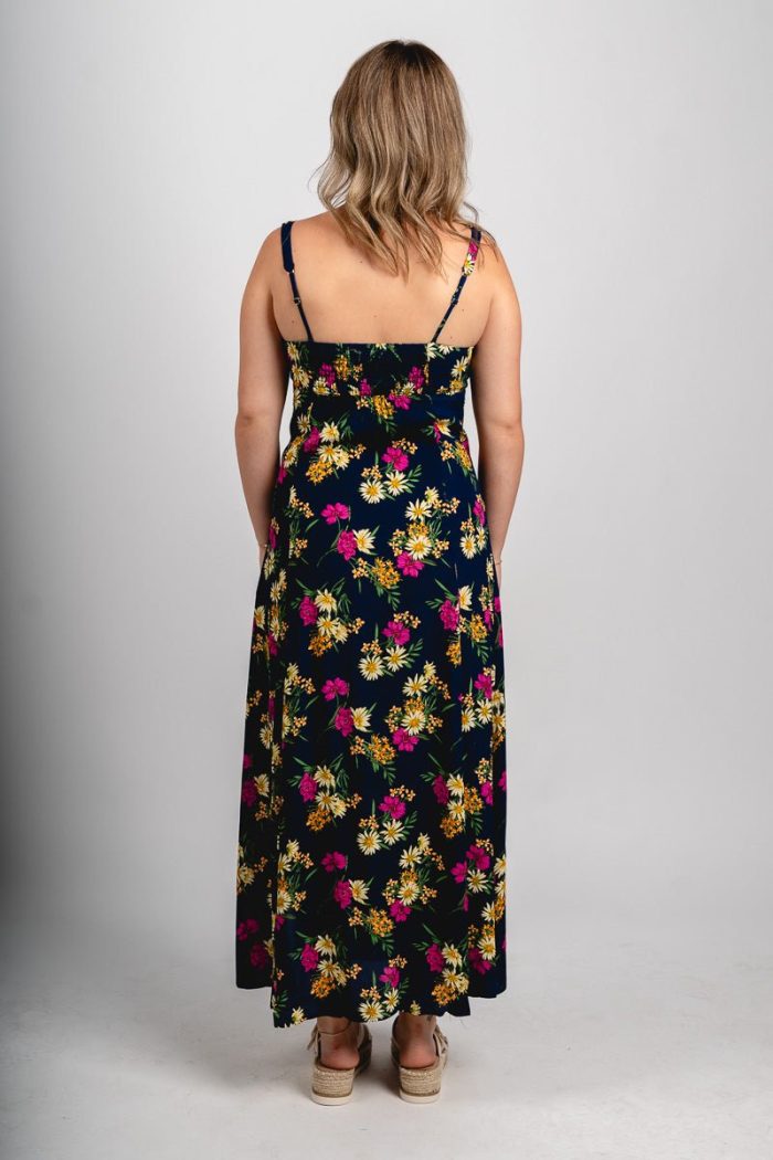 Spaghetti strap navy cotton-like maxi dress with pink, yellow, and green floral detailing from Lush Fashion Lounge women’s boutique in Oklahoma City.