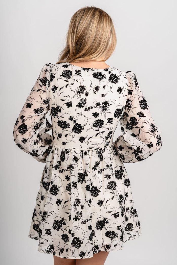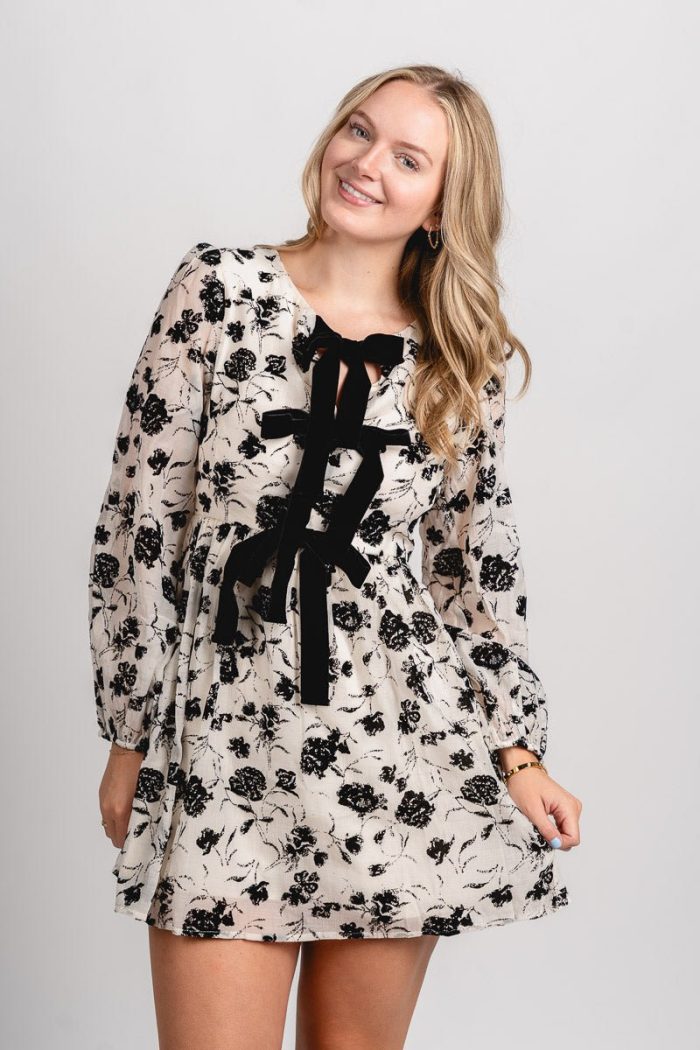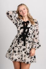 Cream long sleeve baby doll style dress featuring black velvet floral detailing throughout and three black velvet bows at the chest from Lush Fashion Lounge women’s boutique in Oklahoma City.