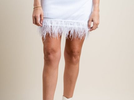 Feather trim mini skirt from Lush Fashion Lounge women’s boutique in Oklahoma City.Lush boutique in OKC has a variety of