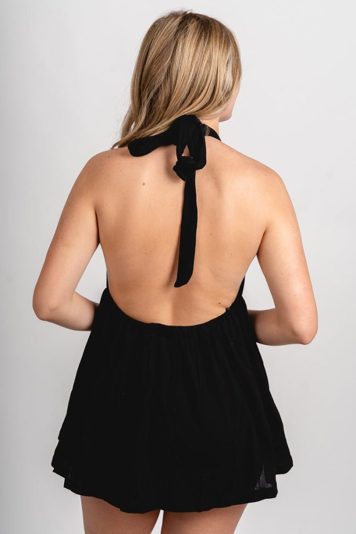 Knit black babydoll romper with a ribbed top that ties around the neck featuring a black skirt with ribbed shorts underneath from Lush Fashion Lounge women’s boutique in Oklahoma City.