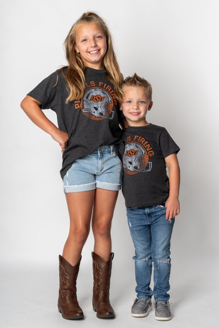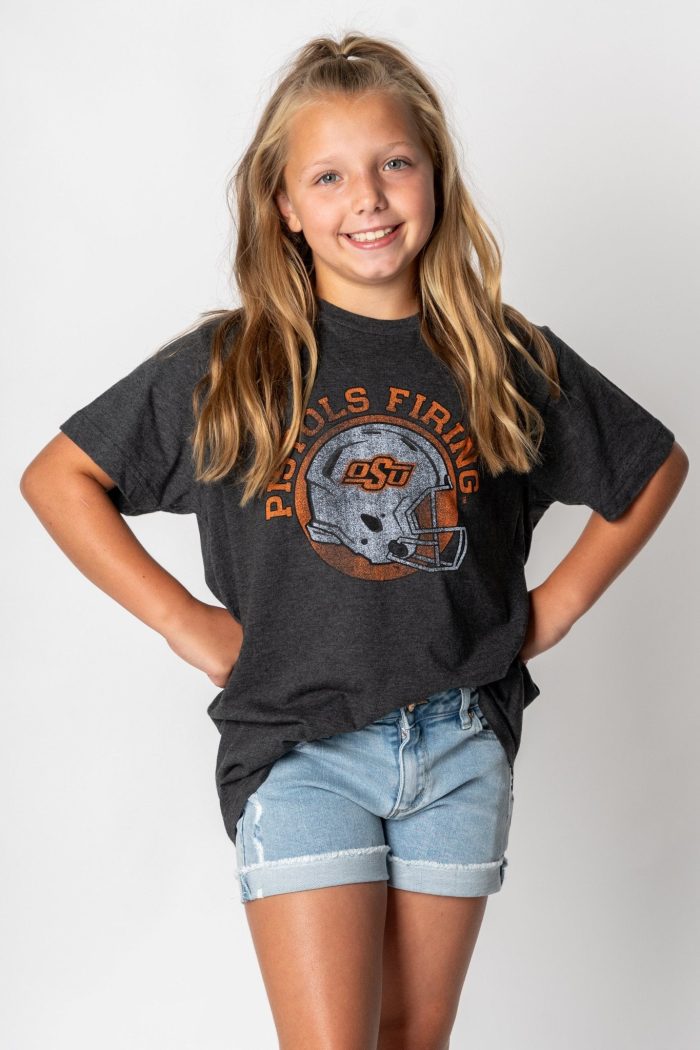 Kids OSU helmet circle t-shirt from Lush Fashion Lounge women’s boutique in Oklahoma City. Lush boutique in Oklahoma is known for a large selection of