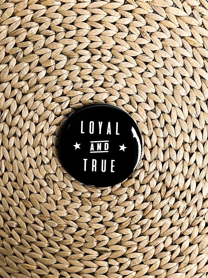 Loyal and True game day button from Lush Fashion Lounge women's boutique in Oklahoma City.Lush boutique in OKC has a variety of cute gameday accessori