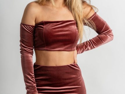 Velvet off shoulder crop top from Lush Fashion Lounge women’s boutique in Oklahoma City.Lush boutique in OKC has a variety