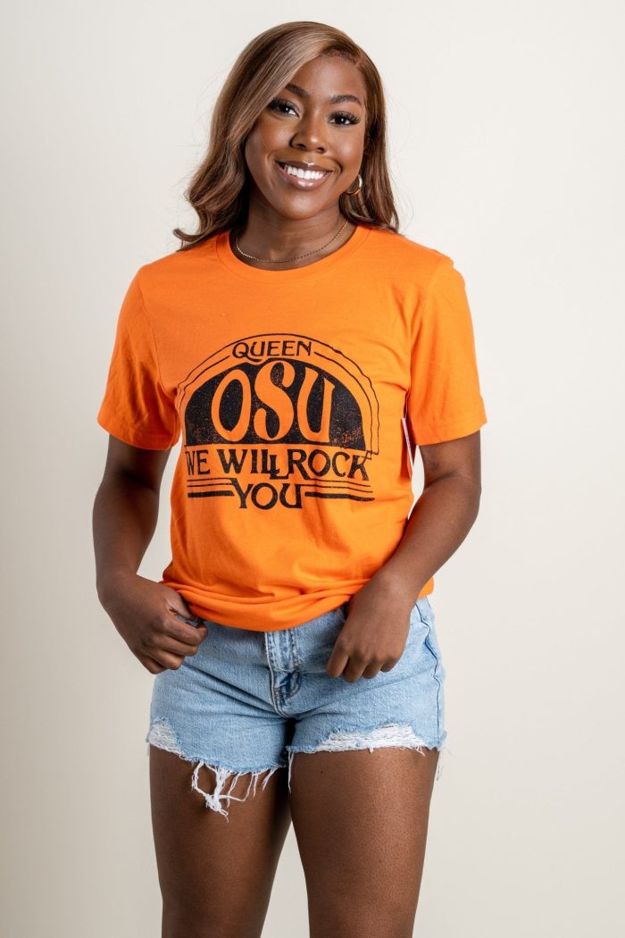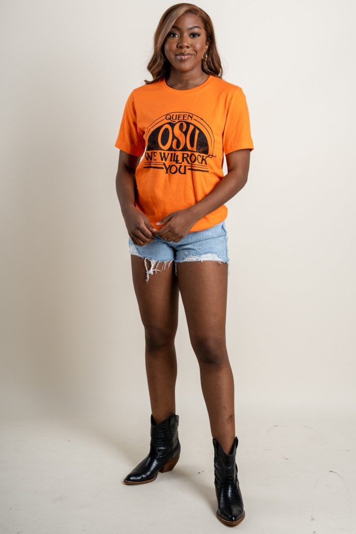 OSU Queen we will rock you t-shirt from Lush Fashion Lounge women’s boutique in Oklahoma City.Lush boutique in Oklahoma has a large selection of OSU t