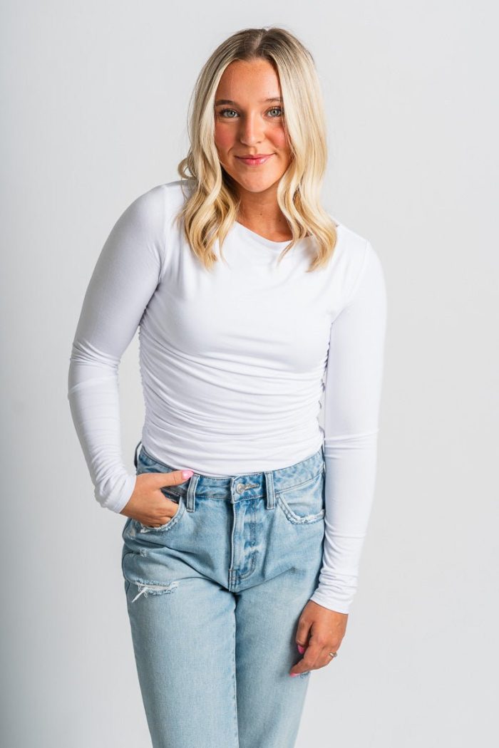 Ruched long sleeve top from Lush Fashion Lounge women’s boutique in Oklahoma City.