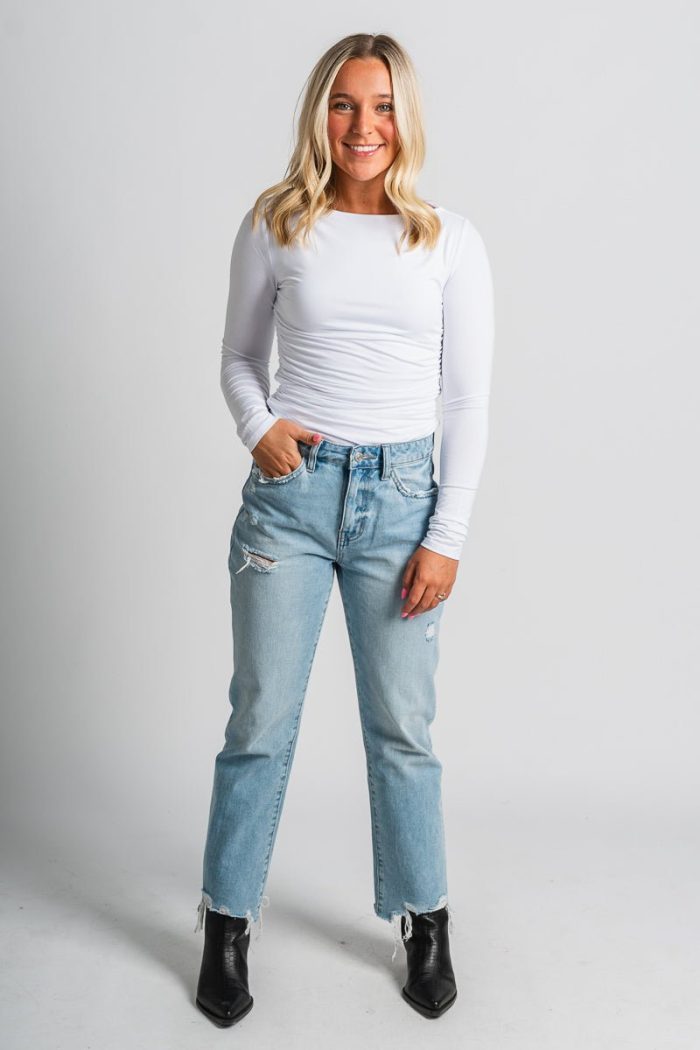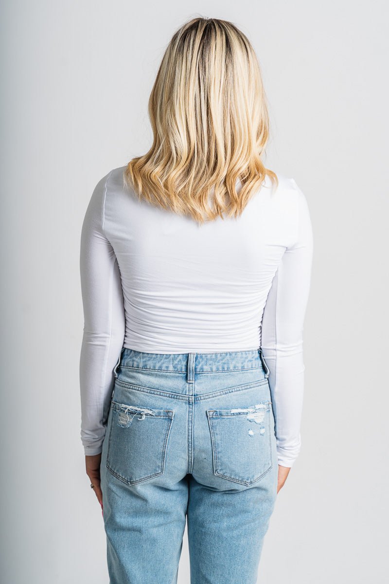 Ruched long sleeve top from Lush Fashion Lounge women’s boutique in Oklahoma City.Lush boutique in OKC has a variety of cute tops and more! This easy
