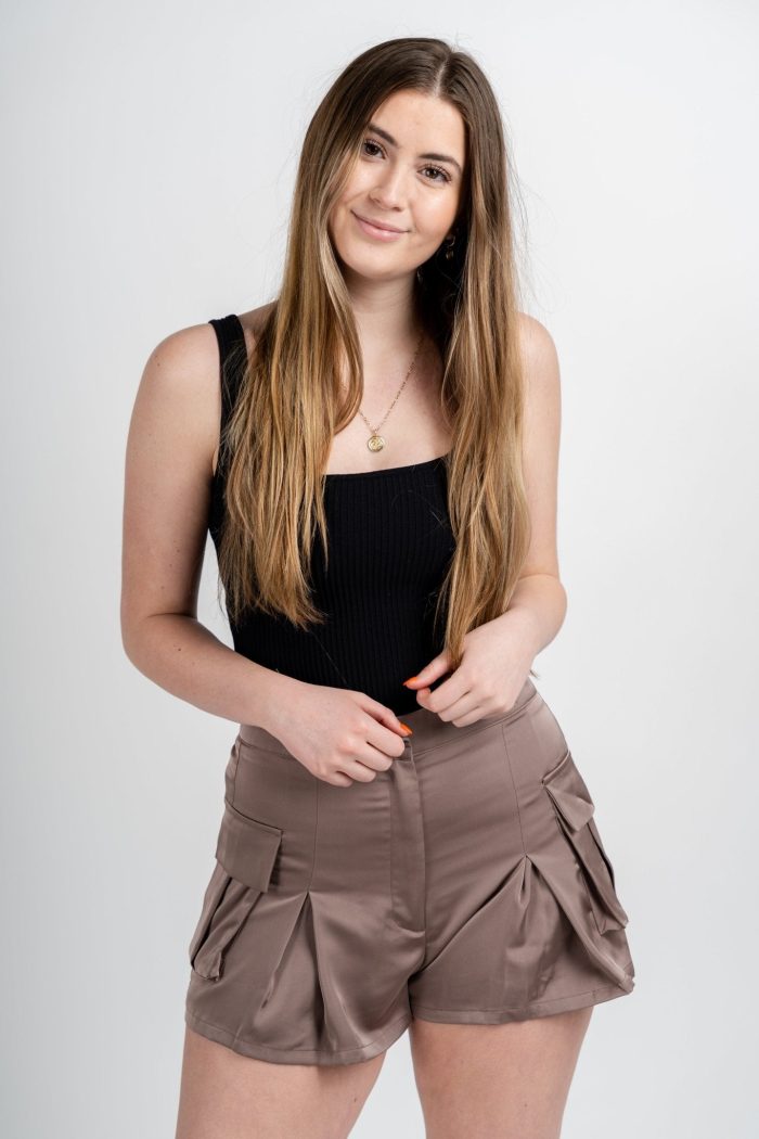 Satin pocket shorts from Lush Fashion Lounge women’s boutique in Oklahoma City.