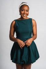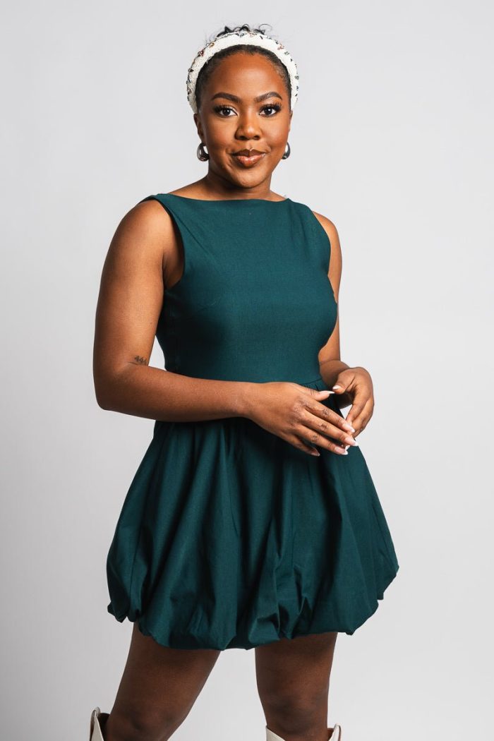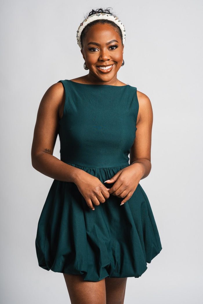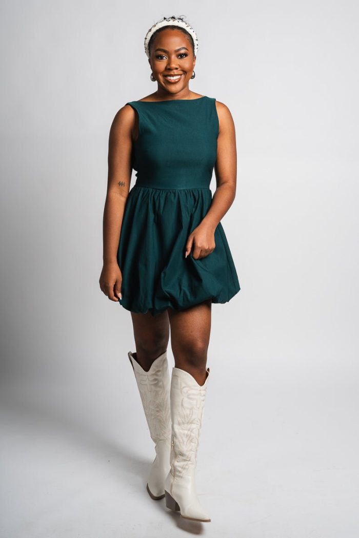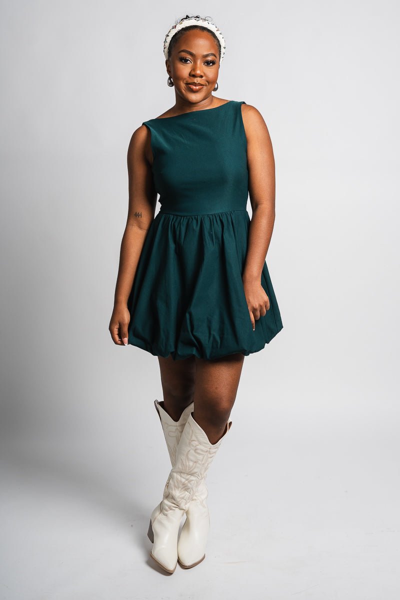 Hunter green bubble hem dress from Lush Fashion Lounge boutique in Oklahoma City.