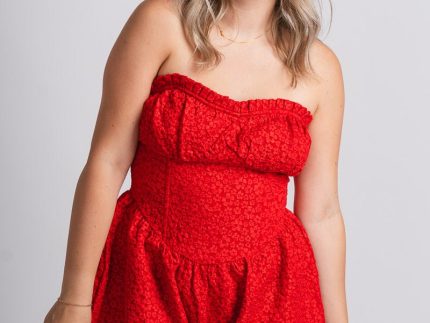 Strapless ruffle romper from Lush Fashion Lounge women's boutique in Oklahoma City.Lush boutique in OKC has a variety of cute dresses, rompers, and mo