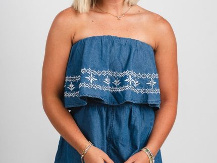 Strapless denim flare romper with ruffle top and white embroidery detailing on ruffle from Lush Fashion Lounge women's boutique in Oklahoma City.Lush