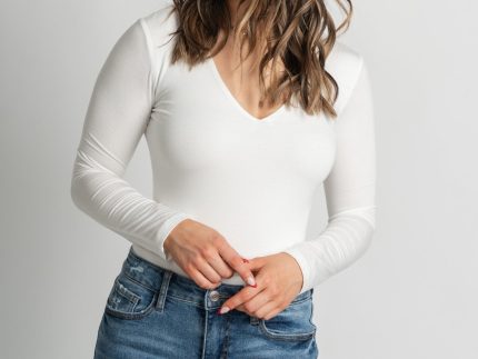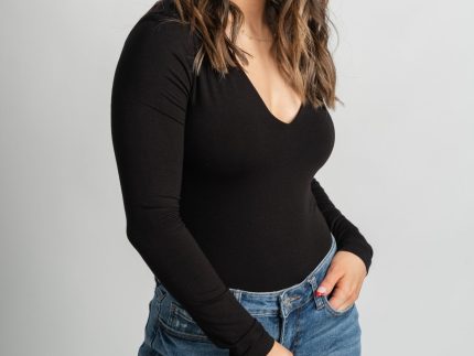 Long sleeve v-neck basic bodysuit from Lush Fashion Lounge women's boutique in Oklahoma City.Lush boutique in OKC has a variety of cute bodysuits and