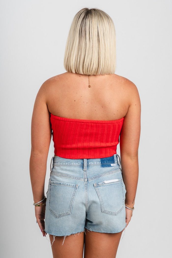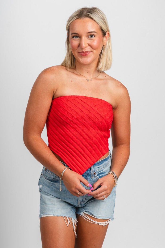 Red strapless sweater scarf cop top that comes to a point at the bottom in the front from Lush Fashion Lounge women’s boutique in Oklahoma City.Lush b
