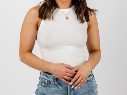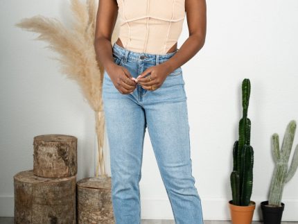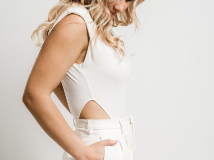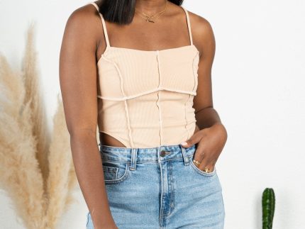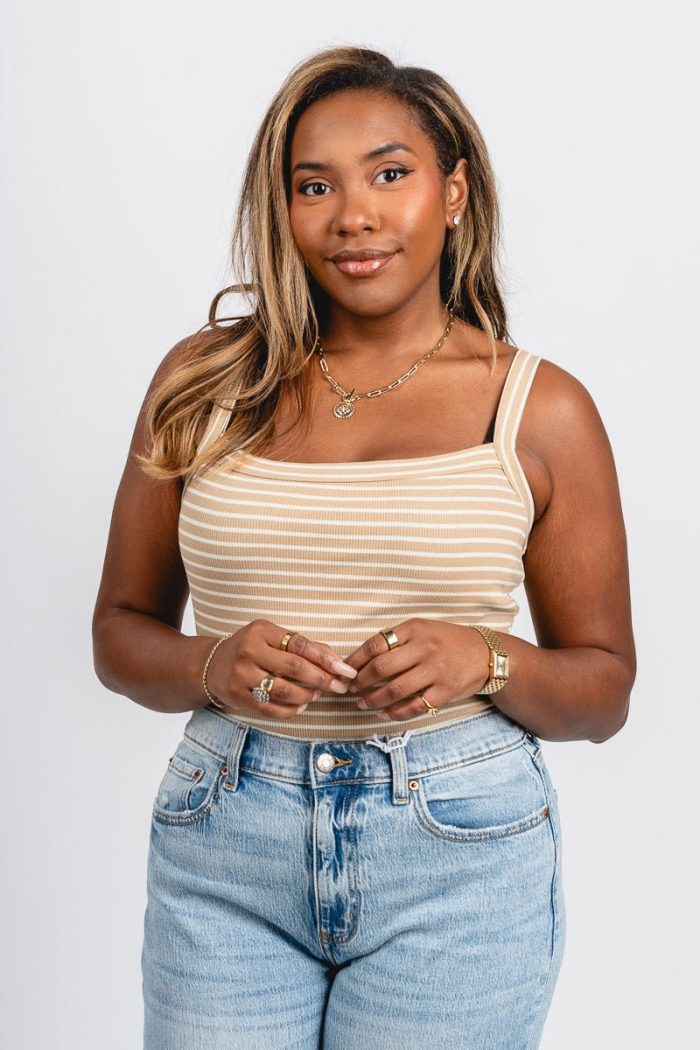 Tan sleeveless bodysuit with a square neck and one inch straps featuring white horizontal stripes from Lush Fashion Lounge women’s boutique in Oklahoma City.