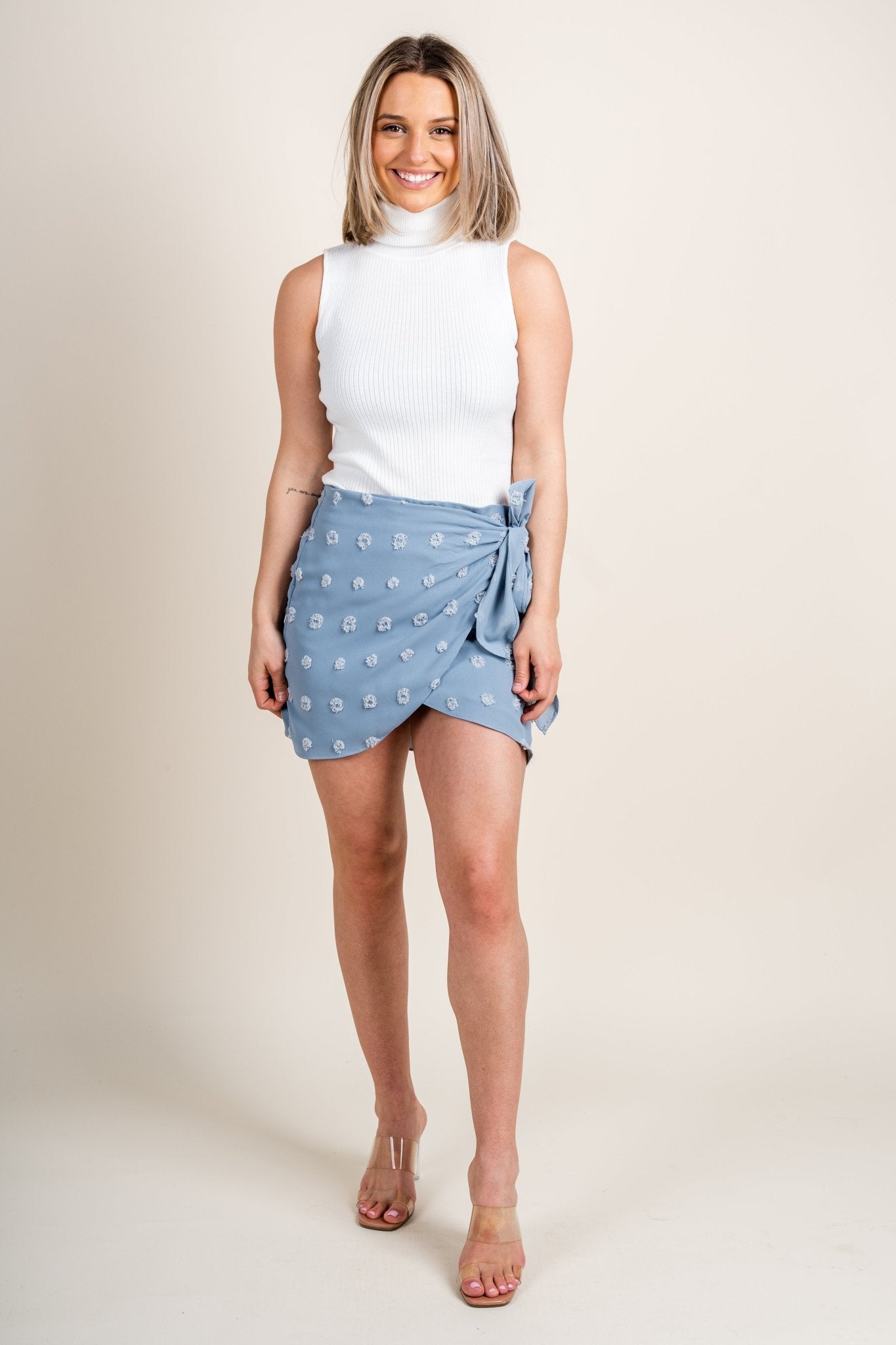 Swiss dot wrap mini skirt from Lush Fashion Lounge women’s boutique in Oklahoma City.