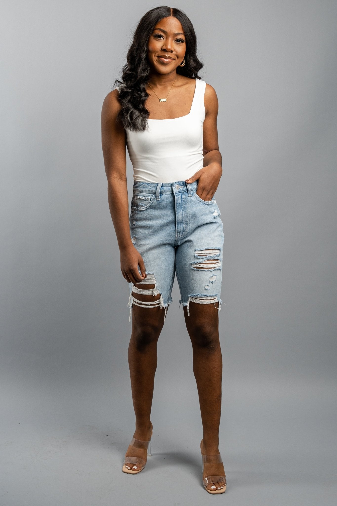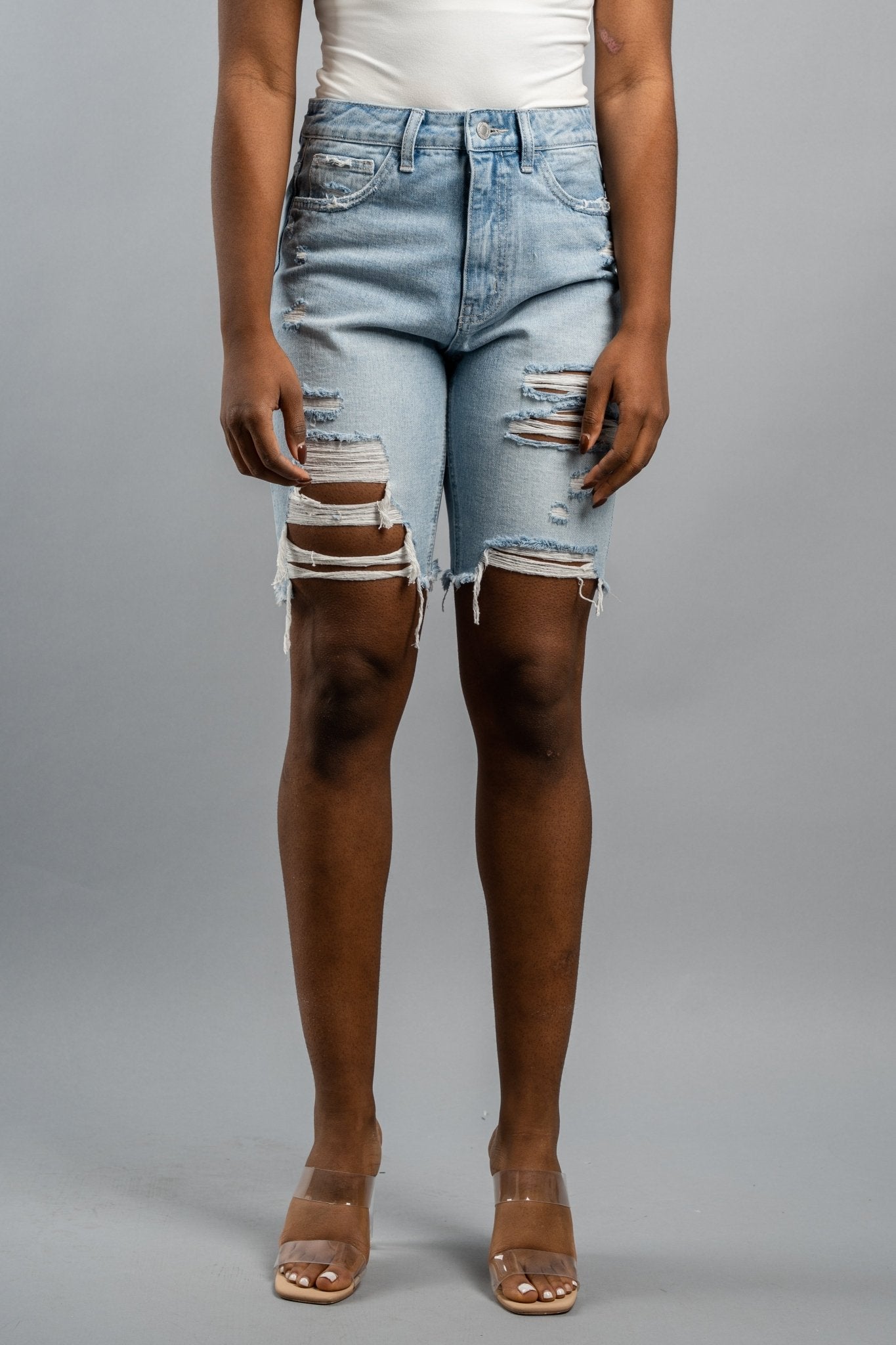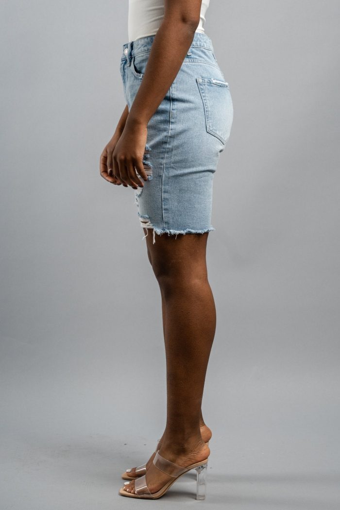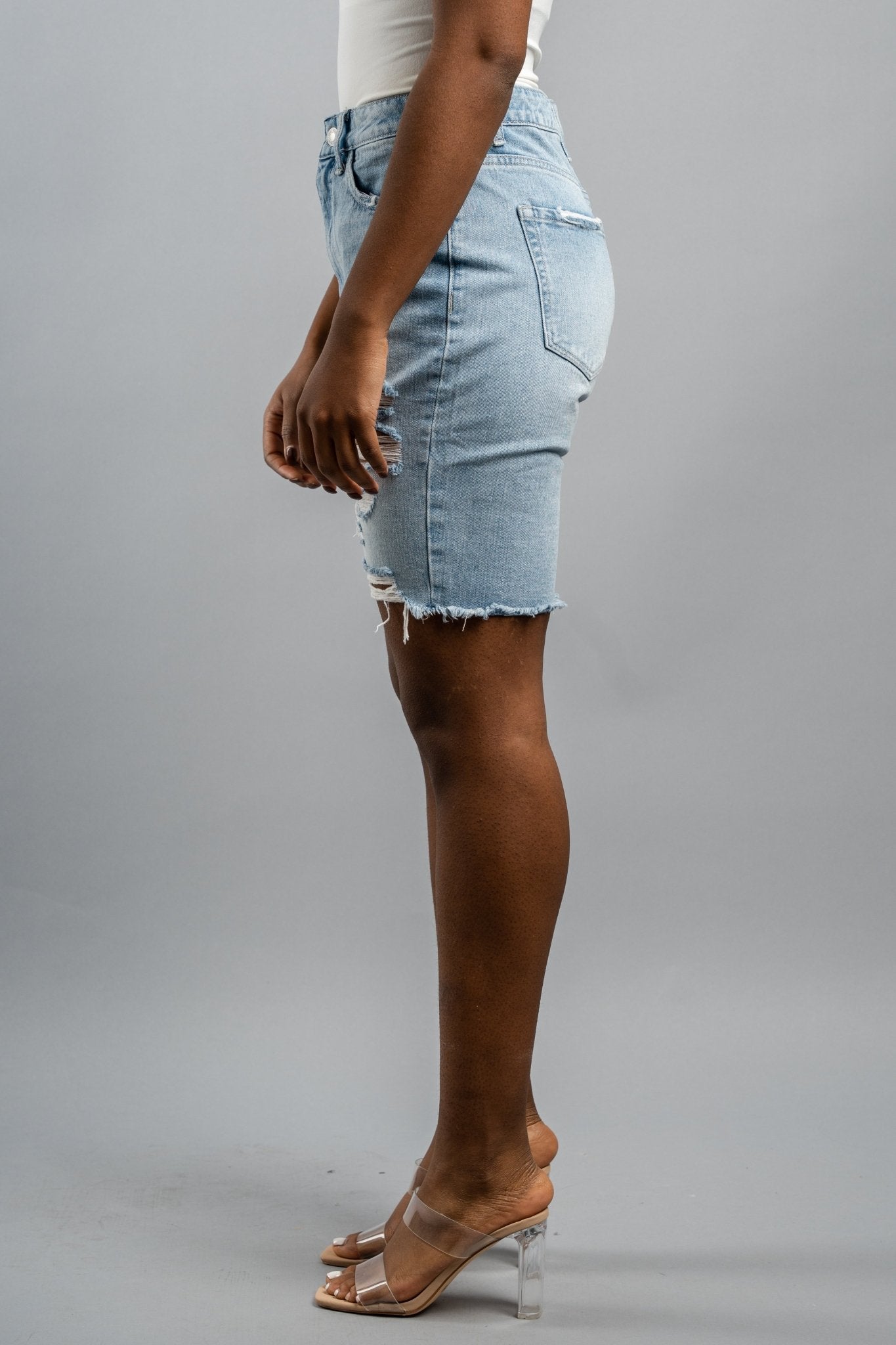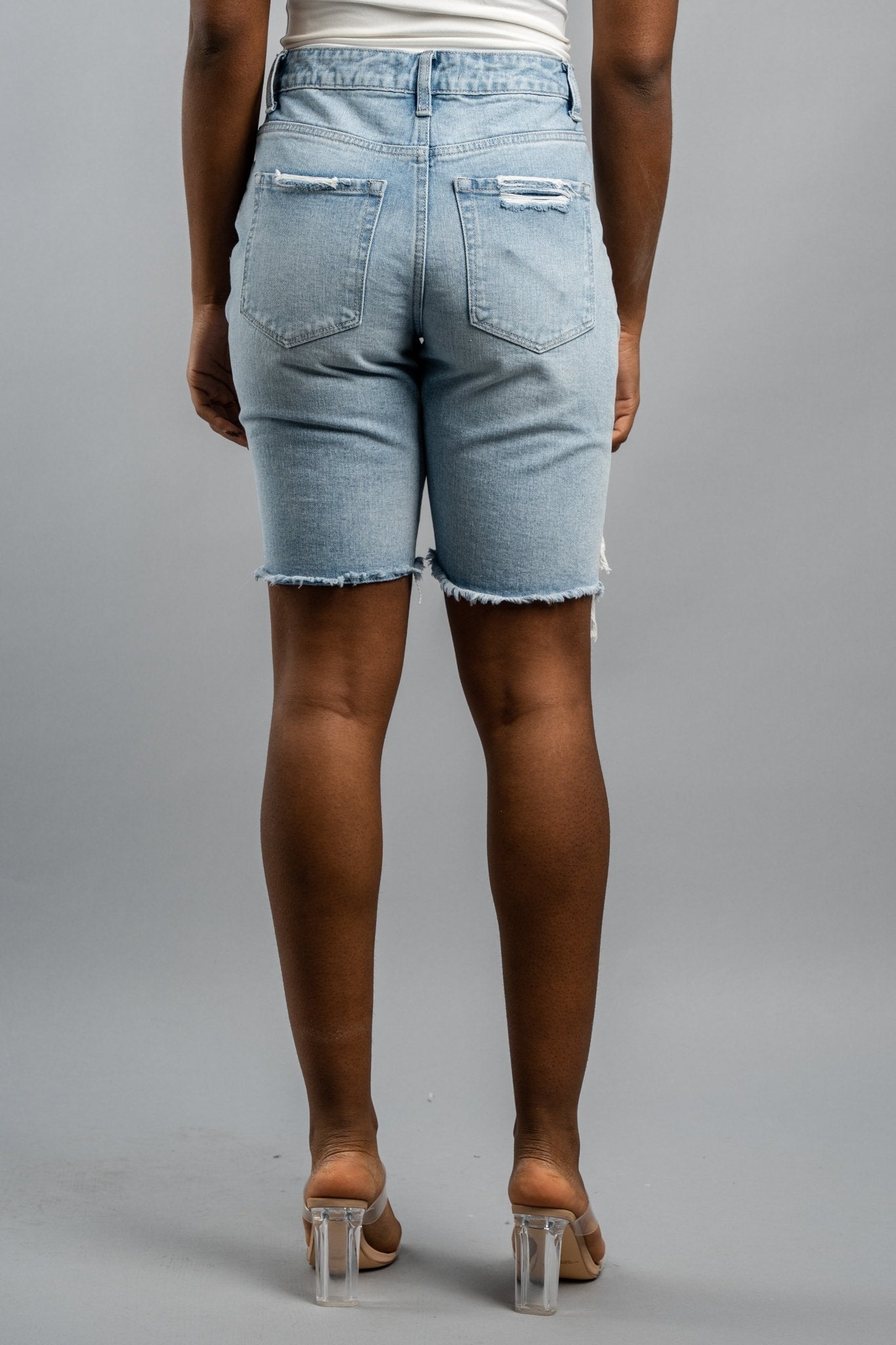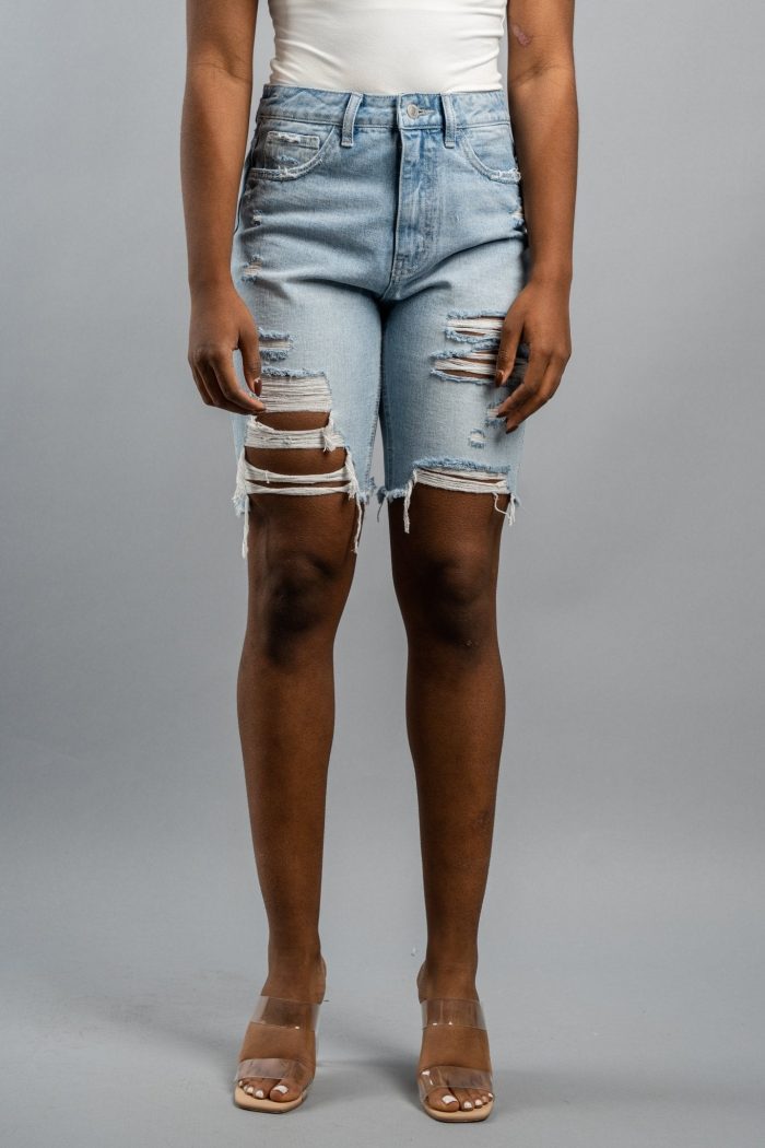 High rise distressed bermuda shorts from Lush Fashion Lounge women’s boutique in Oklahoma City.